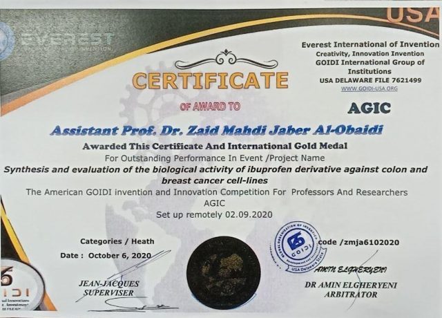 ومن جهة ثانية منحت منظمة افيرست الأمريكية AGIC للدكتور زيد خضر مهدي الوسام الذهبي لبراءة اختراع في تصنيع وتجريب