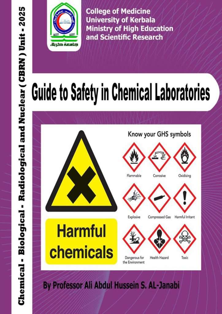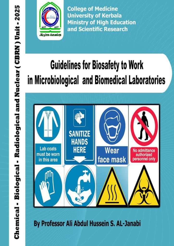 تطبيقاً لتعليمات السلامة البايولوجية والكيميائية خلال العمل في المختبرات الطبية التابعة الى كلية الطب في جامعة كربلاء, إعد الاستاذ الدكتور علي عبد الحسين صادق الجنابي مسؤول وحدة السلامة والامن الكيمائي والبايلوجي والاشعاعي التابع الى كلية الطب دليلين ارشاديين للعمل في المختبرات الطبية وباللغة الانكليزية احدهما خاص للعمل بالمختبرات التي تتعامل مع العينات الطبية يحمل عنوان