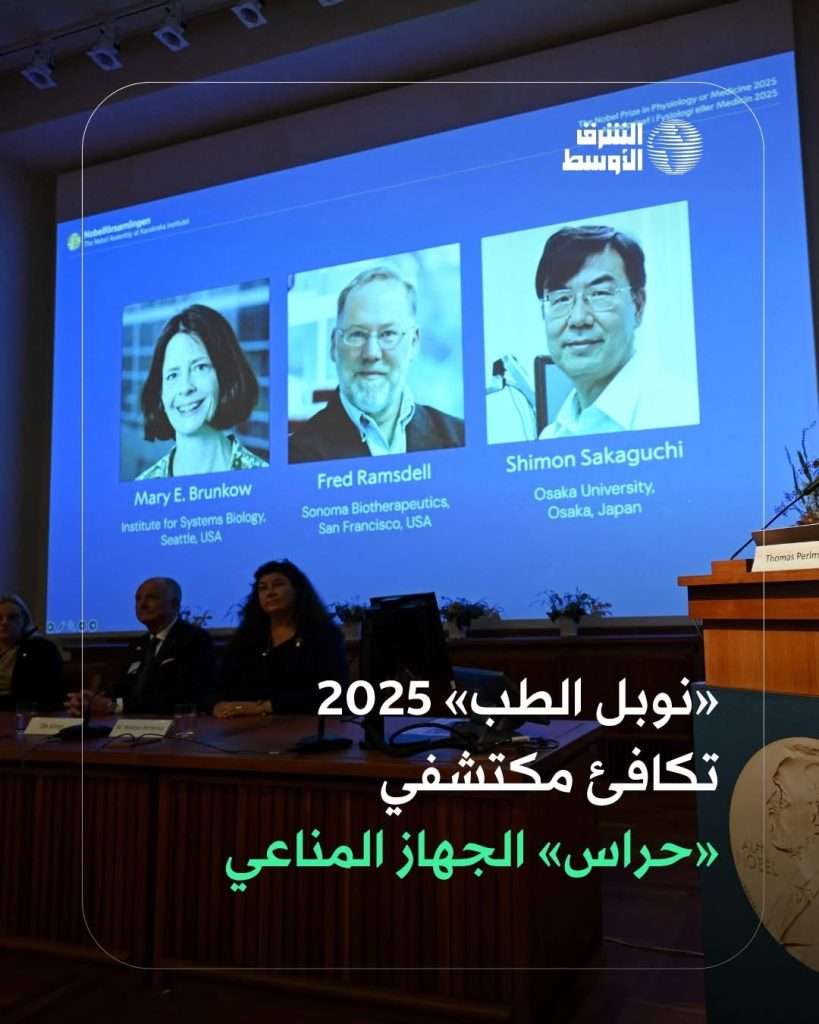 تقديراً لاكتشافاتهم المتعلقة بتحديد نوع من خلايا المناعة المعروفة باسم «الخلايا التائية»، العلماء الفائزون أجابوا على تساؤل: لماذا لا نصاب جميعاً بأمراض مناعة ذاتية خطيرة؟للمزيد حول هذه الخلايا التي تعمل كـ«حراس أمن» للجهاز المناعيhttps://aawsat.com/node/5194338