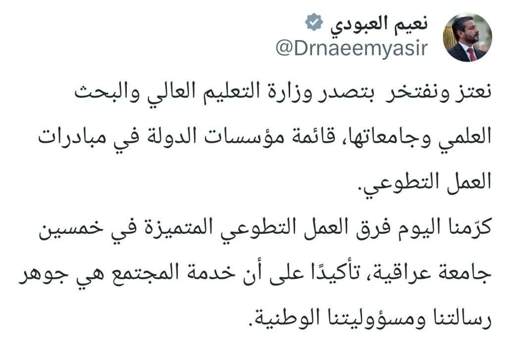 وزارة التعليم العالي والبحث العلمي وجامعاتها تتصدّر قائمة مؤسسات الدولة في مبادرات العمل التطوعي.. والدكتور نعيم العبودي يكرم الفرق المتميزة في خمسين جامعة عراقية