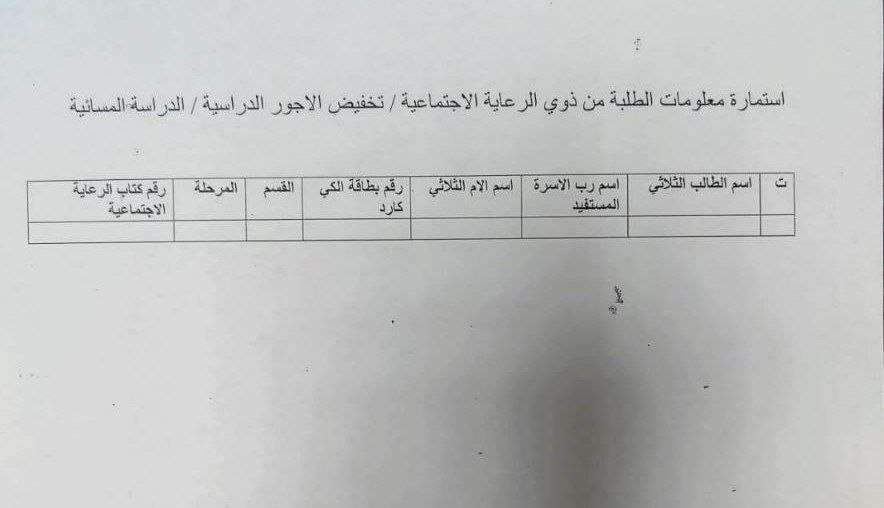 استمارة طلب تخفيض الأجور الدراسية بنسبة 50% الدراسة المسائية للطلاب من فئة الرعاية الاجتماعية للعام الدراسي 2025/2026