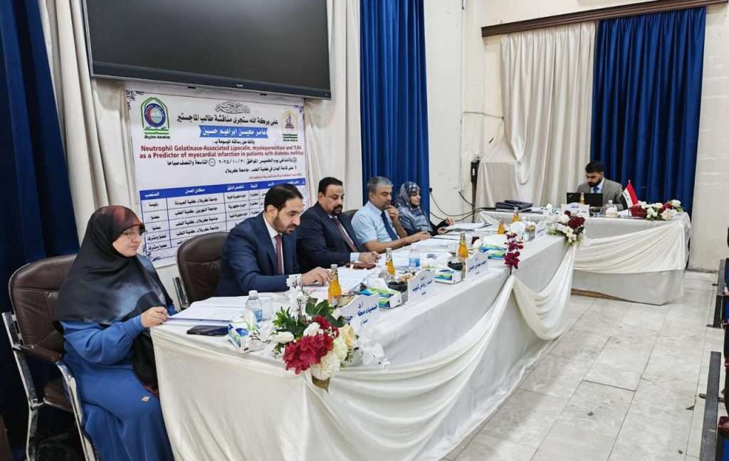 ناقشت رسالة ماجستير في جامعة كربلاء- كلية الطب / فرع الأحياء المجهرية الطبية للطالب : عامر محيسن إبراهيم ، والتي حملت عنوان “تقييم الميلوبيروكسيديز المرتبد بالجيلاتيناز المتعادلة والليبوكالين ومستقبل التول الشبيه بالمستقبل كمؤشر على احتشاء عضلة القلب لدى مرضى السكري من النوع الثاني” هدفت الدراسة إلى: تقييم العلاقة بين داء السكري من النوع الثاني (T2DM) و أمراض القلب الإقفارية (IHD) ، ودراسة تأثير بعض المؤشرات الحيوية الالتهابية والقلبيّة مثل (hs-cTn, HbA1c, TLR4, NGAL, MPO) على خطورة الإصابة بمرض القلب الإقفاري لدى مرضى السكري من النوع الثاني. كما سعت لتحديد دور الالتهابات المزمنة ونقص الارتواء الدموي في زيادة خطر أمراض القلب بين مرضى السكري . أظهرت النتائج ارتفاعاً معنوياً في مستويات المؤشرات الحيوية القلبية والالتهابية لدى مرضى السكري المصابين بمرض القلب الإقفاري مقارنة بغير المصابين . سجلت الدراسة ارتفاعاً ملحوظاً في HbA1c و hs-cTn و TLR4 و NGAL و MPO لدى مرضى السكري المصابين بالقلب الإقفاري. بينما لم تُظهر مستويات الكوليسترول عالي الكثافة (HDL) أي فرق جوهري بين المجموعات. أكما اوصت الدراسة : تؤكد الدراسة على ضرورة الإدارة الشاملة للسكري عبر ضبط مستوى HbA1c والدهون والالتهابات لتقليل خطر أمراض القلب ، تدعم النتائج أهمية استخدام المؤشرات الحيوية (TLR4, MPO, NGAL, hs-cTn) كأدوات تشخيصية وتنبؤية لتقدير خطر الإصابة بأمراض القلب الإقفارية لدى مرضى السكري. وتوصي الدراسة بضرورة تقييم المخاطر المتعددة (السكر، الدهون، الالتهاب، ضغط الدم) ضمن برامج علاج ومتابعة مرضى السكري للوقاية من المضاعفات القلبية. تألفت لجنة المناقشة من : أ. د. احمد عباس حسن / رئيساً أ. د. حيدر فيصل غازي / عضواً أ.م.د. مسار رياض الموسوي / عضواً أ. د. الاء سعد حنفوش / عضواً ومشرفاً أ. د. ضمياء مكي حمزه / عضواً ومشرفاً.