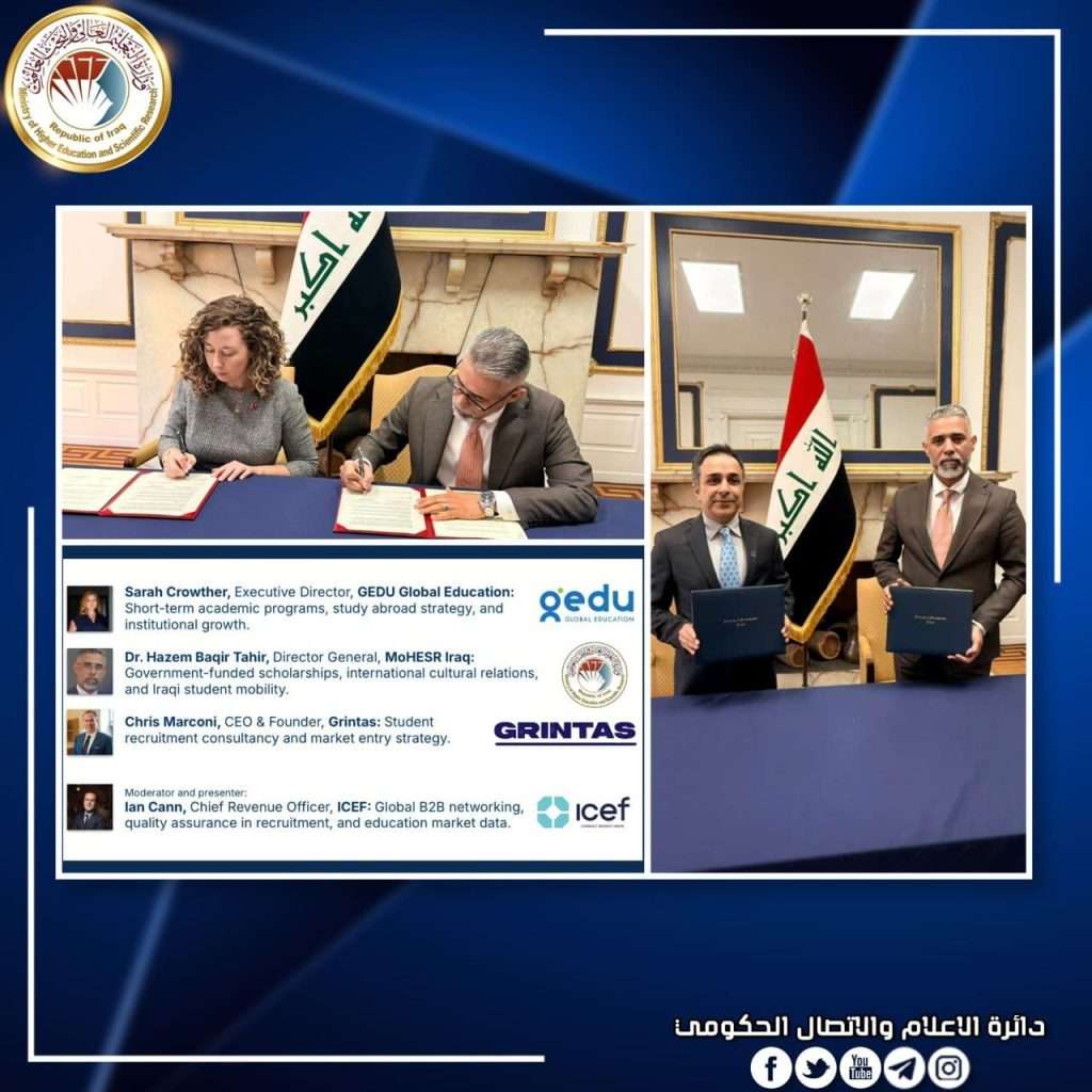 وجرى توقيع مذكرة التفاهم وخطاب النوايا في واشنطن على هامش المؤتمر السنوي لرابطة التعليم الدولي AIEA Annual Conference 2026 الذي شارك فيه العراق ممثلا بوزارة التعليم العالي والبحث العلمي إلى جانب ممثلي المؤسسات الأكاديمية العالمية.